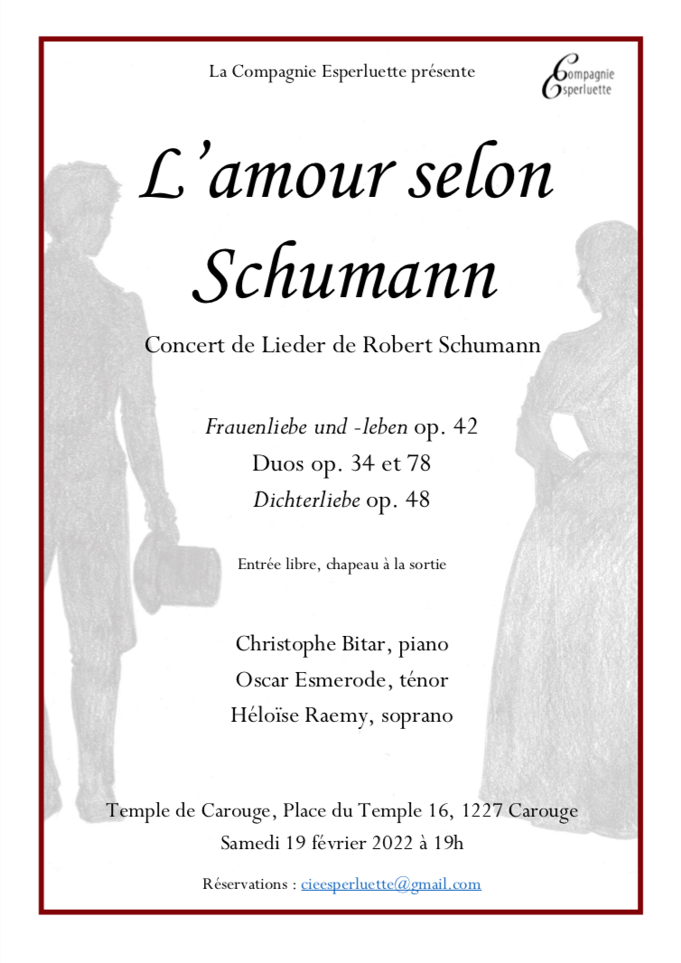 En février 2022, la Compagnie Esperluette met à l'honneur un trio de jeunes artistes. La soprano Héloïse Raemy, le ténor Oscar Esmerode et le pianiste Christophe Bitar régalent un public nombreux avec un programme musical romantique, entièrement dédié à Robert Schumann : on peut y entendre des cycles de lieder comme Dichterliebe ou Frauenliebe und -leben, ainsi que de nombreux duos évoquant l'amour.