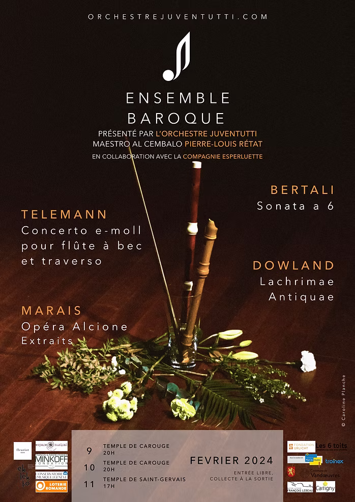 La Compagnie Esperluette réitère sa fructueuse collaboration avec l'Ensemble Baroque de l'Orchestre Juventutti pour la troisième fois.Cette édition présente un florilège de toute beauté et offre une immersion dans l'oeuvre de TELEMANN, BERTALI, DOWLAND et MARAIS, sous la direction de Pierre-Louis RÉTAT. Une invitation à (re)découvrir des perles du répertoire baroque et à faire vivre cette musique enjouée, vivante et légère !