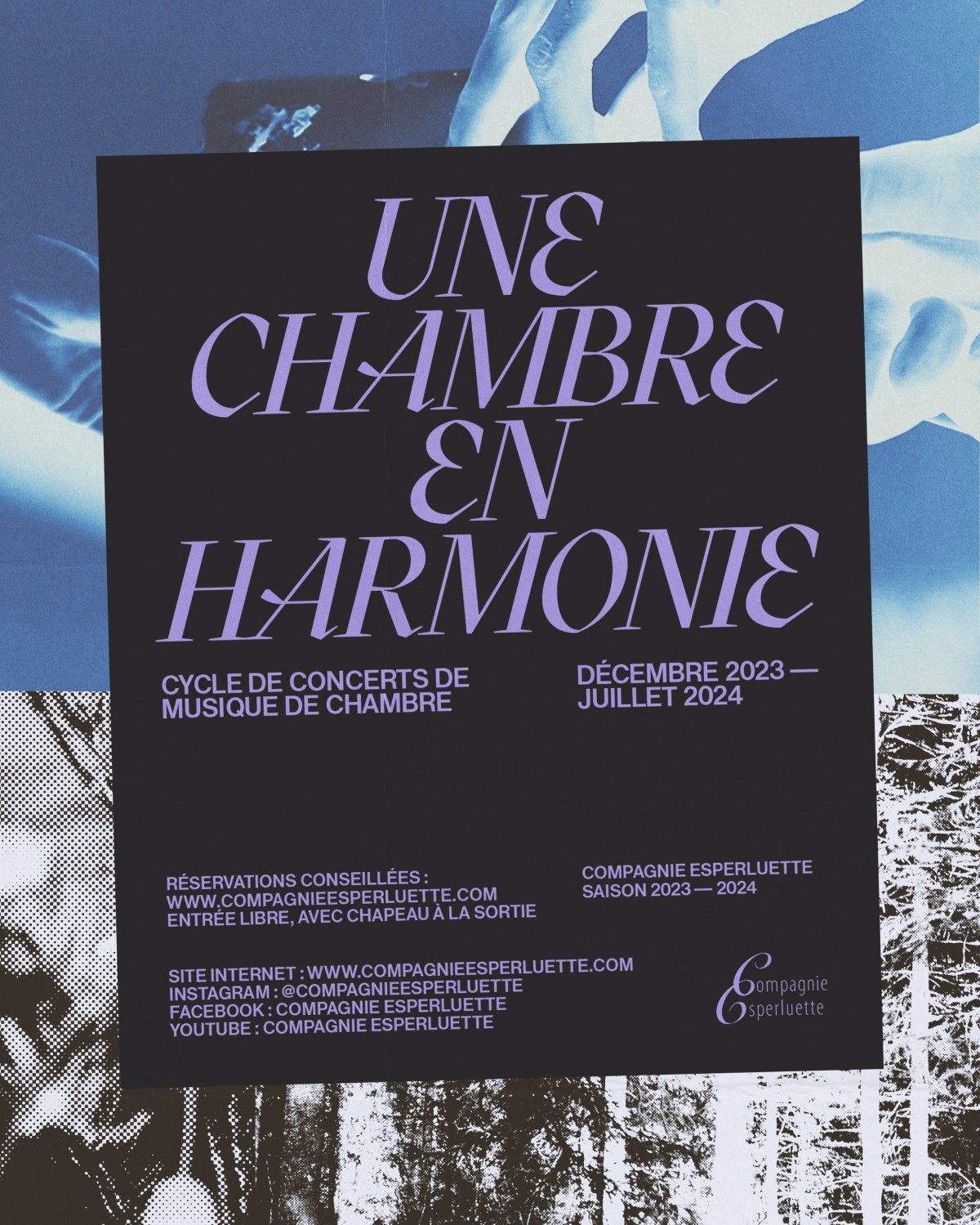 Cette saison, la Compagnie Esperluette embrasse le monde de la musique de chambre et souhaite mettre en lumière son extraordinaire richesse. La Compagnie estime que la pratique en effectif réduit permet le dévoilement de l’expressivité individuelle et souligne l’osmose collective. Ce cycle de sept concerts invite le public à découvrir un répertoire splendide dans le cadre intimiste du Temple de Carouge. Avec Une Chambre en Harmonie, la Compagnie Esperluette désire offrir un espace protégé et bienveillant pour permettre à de jeunes musicien.ne.s de laisser libre cours à leur expressivité et leur musicalité.